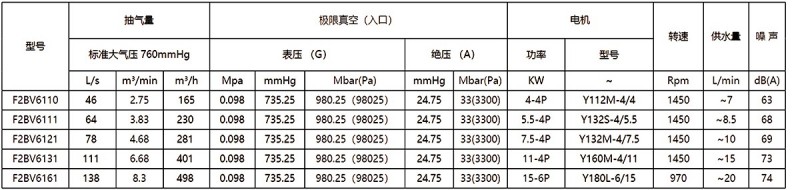 2.上列性能基于進氣溫度20℃,進水溫度15℃,排氣壓力1013hpa的條件,被吸入氣體為飽和空氣。(飽和空氣是指在對應吸入狀態下,其相對濕度為100%的濕空氣。)3.抽氣速率、軸功率性能允差10%