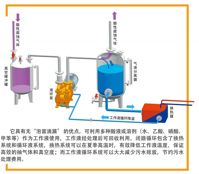 耐腐蝕液環(huán)泵可以升級(jí)為閉路循環(huán)系統(tǒng),它由FSK系列、F2SK系列、F2BV系列、F2BE系列和JZJFS羅茨泵系列,與真空換緩沖罐、汽液分離器、換熱器、連接管路等串聯(lián)組成。閉路循環(huán)與用戶(hù)DCS 連接可實(shí)現(xiàn)自動(dòng)控制。